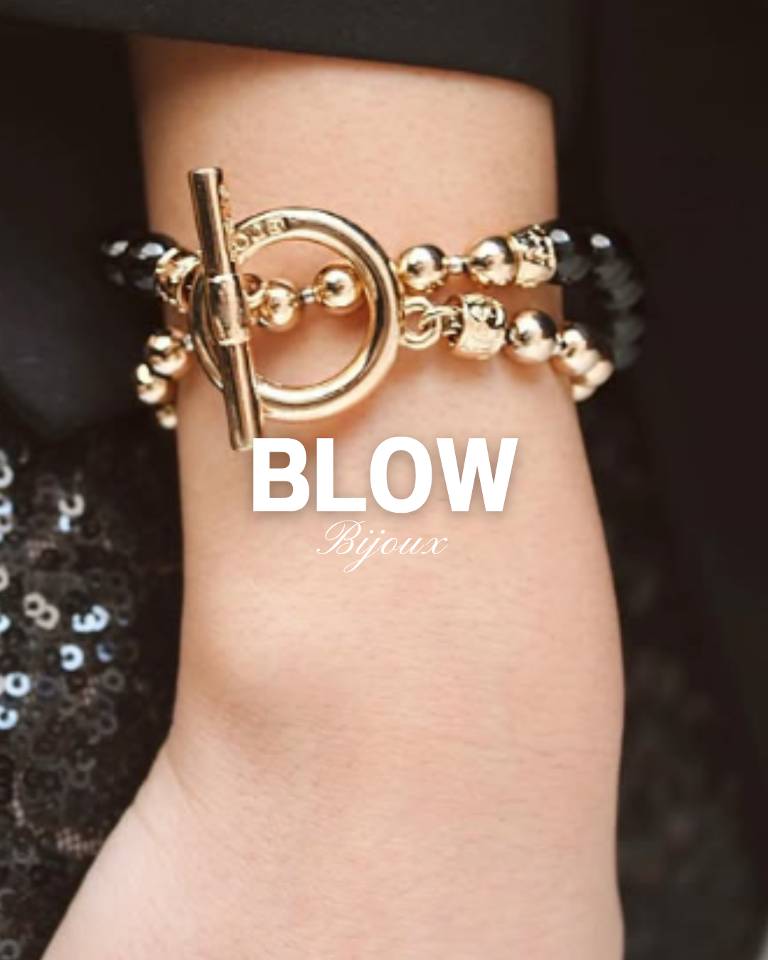 Bracelet en or avec perles noires et un fermoir circulaire ornementé, porté au poignet, avec le texte 'BLOW Bijoux' superposé.